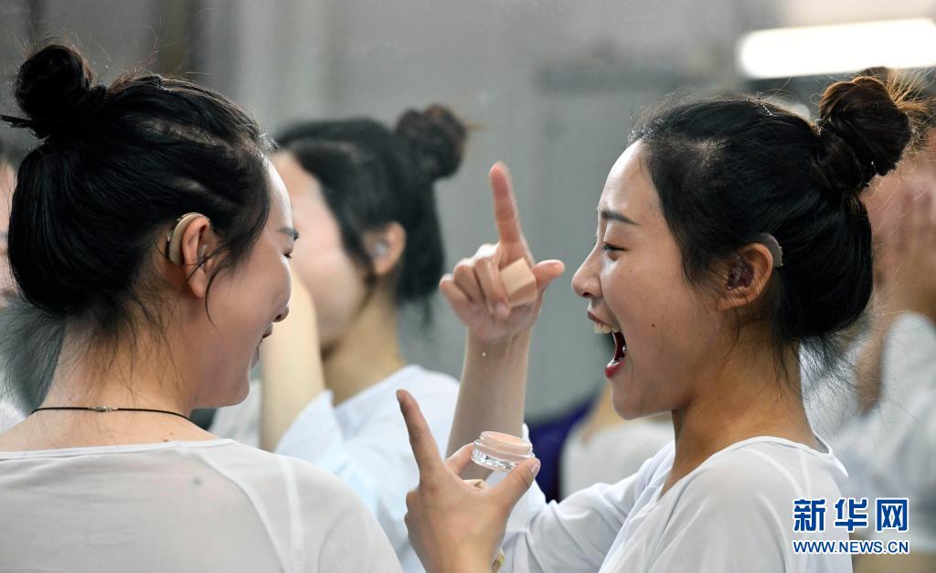 天津理工大學(xué)聾人工學(xué)院的舞蹈隊(duì)員們在學(xué)校的劇場里化妝時交流(5月10日攝)。新華社記者 趙子碩 攝