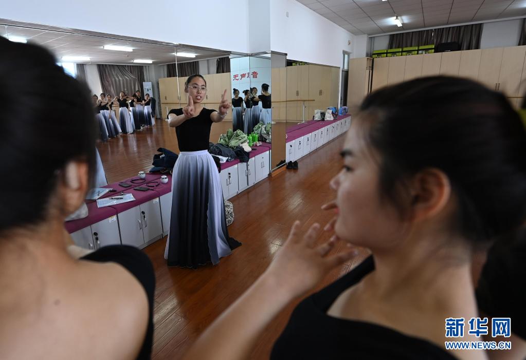 天津理工大學(xué)聾人工學(xué)院的舞蹈隊(duì)員們在學(xué)院的排練廳里練習(xí)(5月8日攝)。新華社記者 李然 攝
