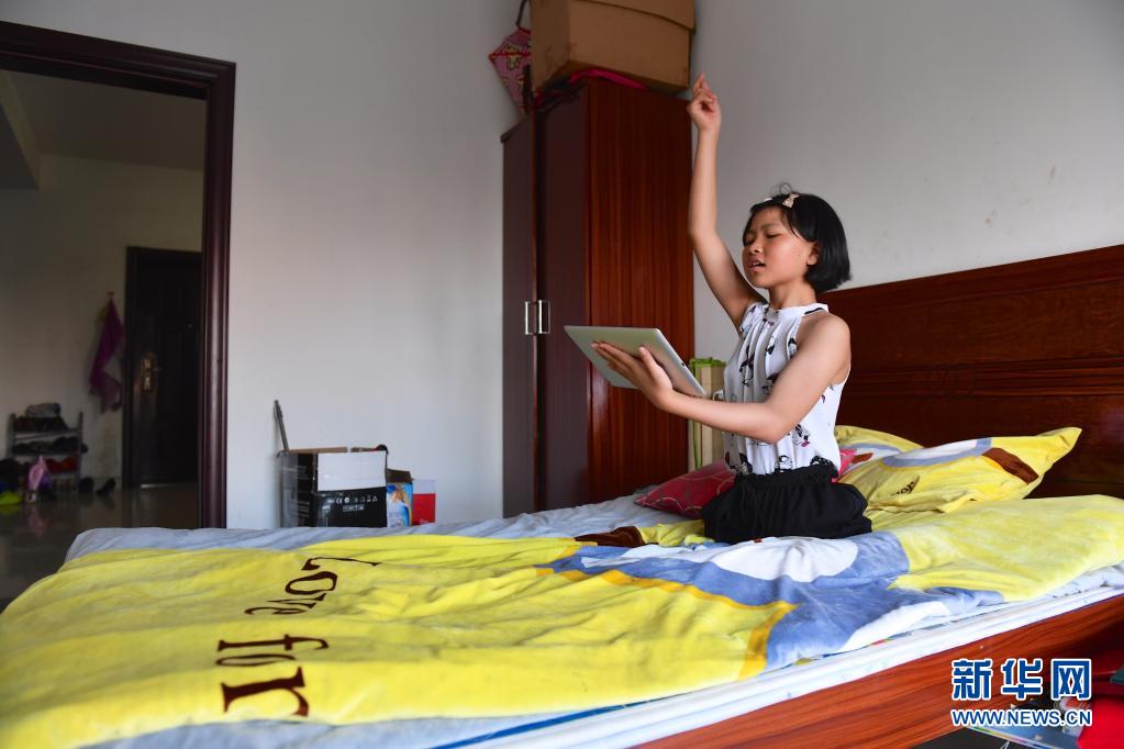 2017年5月17日,下課回家后,蔣張子怡在床上利用平板電腦學(xué)習(xí)舞蹈。