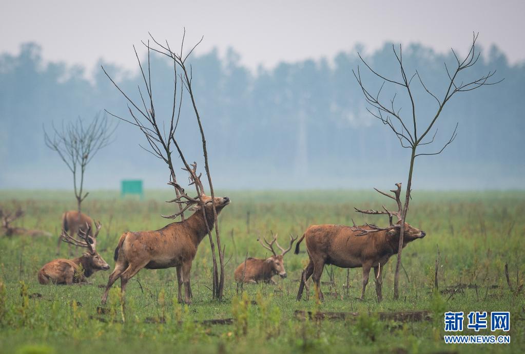 5月17日,一群麋鹿在石首麋鹿國家級自然保護區(qū)內活動。新華社記者 肖藝九 攝