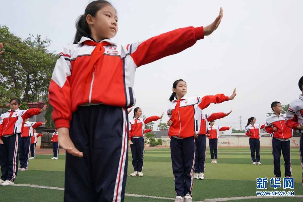 5月19日,邢臺市內(nèi)丘縣實(shí)驗(yàn)小學(xué)學(xué)生在操場上練習(xí)武術(shù)操。