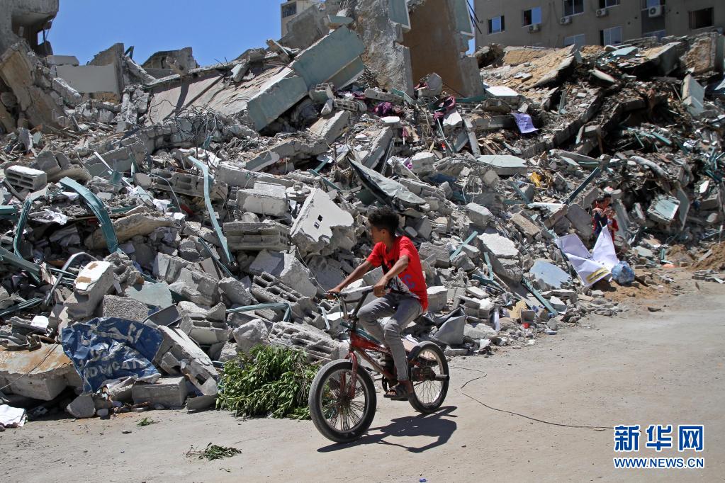 5月23日,一個(gè)男孩在加沙城騎車(chē)經(jīng)過(guò)遭以軍空襲損毀的賈拉塔。5月10日以來(lái),以色列與加沙地帶武裝組織之間爆發(fā)嚴(yán)重沖突。20日晚,哈馬斯與以色列方面各自宣布,雙方已達(dá)成?;饏f(xié)議,?;饛?1日凌晨開(kāi)始。新華社發(fā)(里澤克·阿卜杜勒·賈瓦德攝)