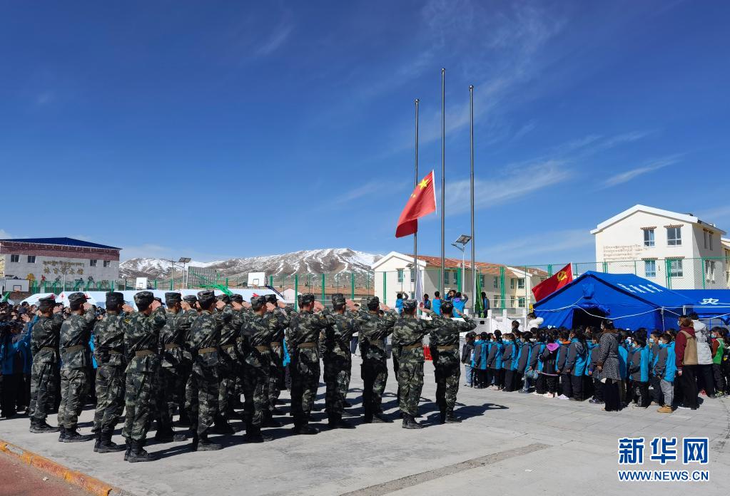 5月24日,武警青海總隊果洛支隊機(jī)動大隊官兵與花石峽鎮(zhèn)藏文中心寄宿制小學(xué)的師生一同參加升國旗儀式。新華社發(fā)(宦爵才郎 攝)
