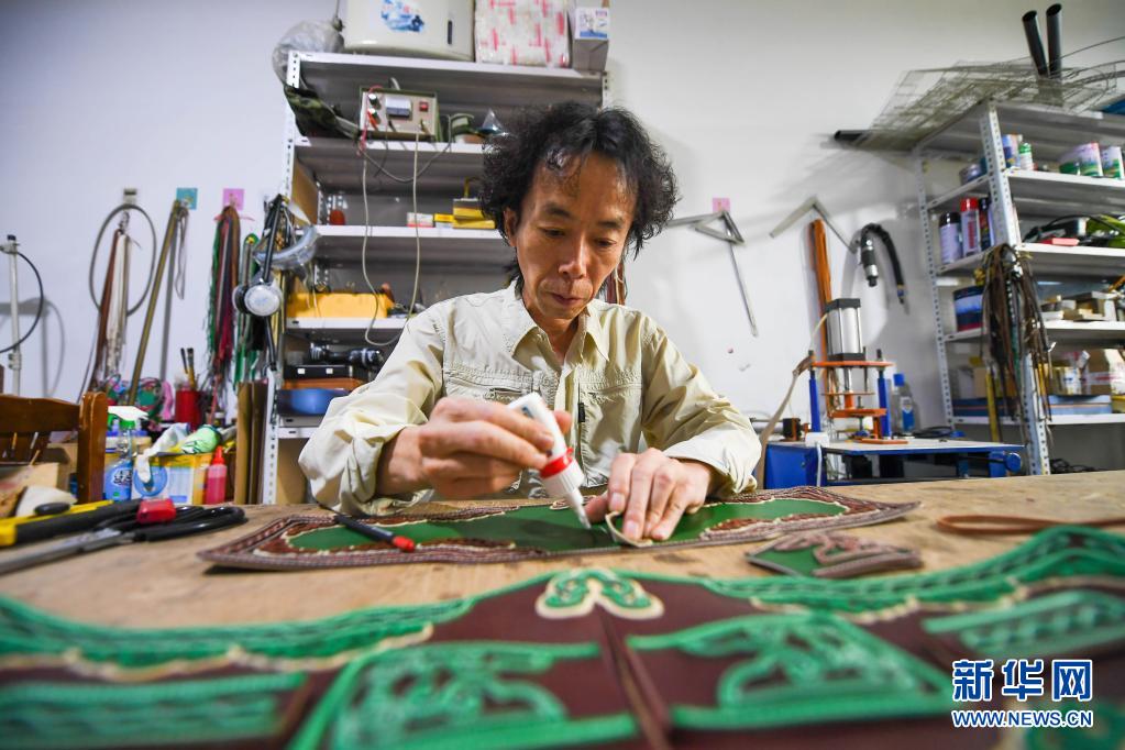 5月26日,錫林虎在工作室內(nèi)制作手工藝品。