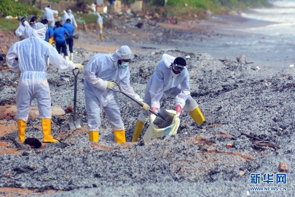 5月27日,安全人員在距離科倫坡30多公里的斯里蘭卡西海岸城市尼甘布清理被海水沖到這里的集裝箱船“X-PRESS PEARL”的碎片。