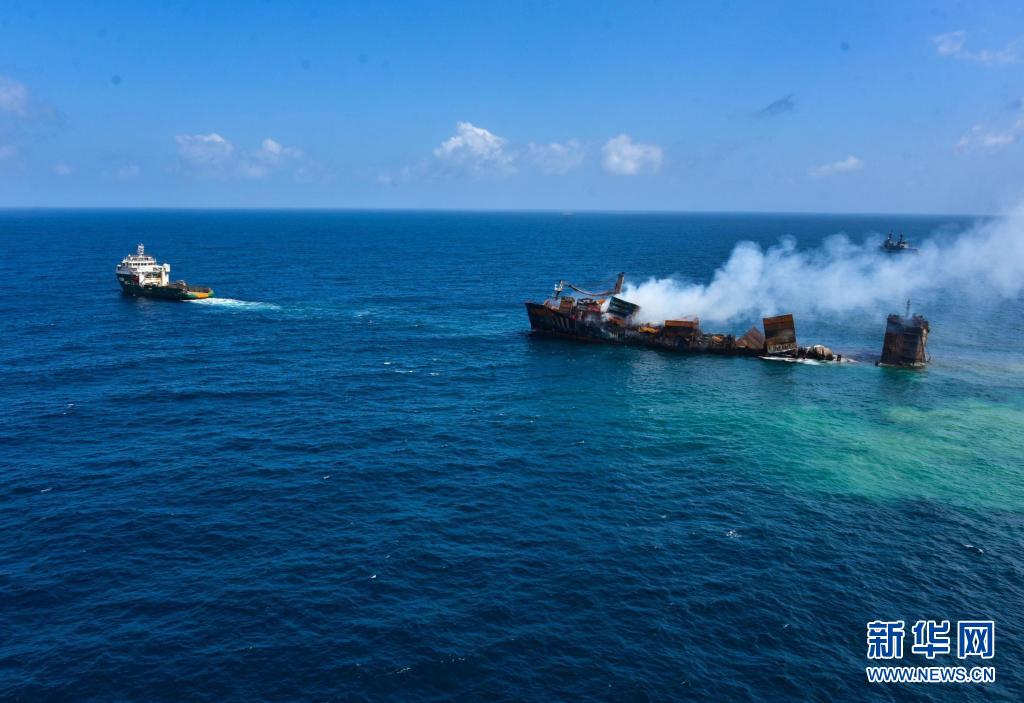 這是6月2日在斯里蘭卡科倫坡港附近拍攝的逐漸下沉的起火貨船“X-PRESS PEARL”號(hào)(右)。