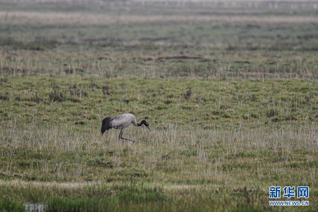這是6月2日在甘肅省甘南藏族自治州碌曲縣尕海湖拍攝的國(guó)家一級(jí)保護(hù)動(dòng)物黑頸鶴。