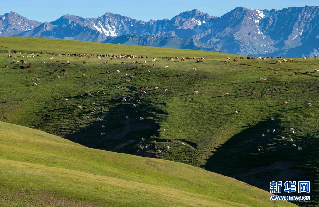 眼下,巴爾魯克山區(qū)的夏牧場(chǎng)迎來放牧黃金季。群山起伏,峰巒翠綠,氈房、牛羊等牲畜分散點(diǎn)綴其間,自駕游客時(shí)而穿梭往來,共同譜寫一曲高山夏季牧歌。