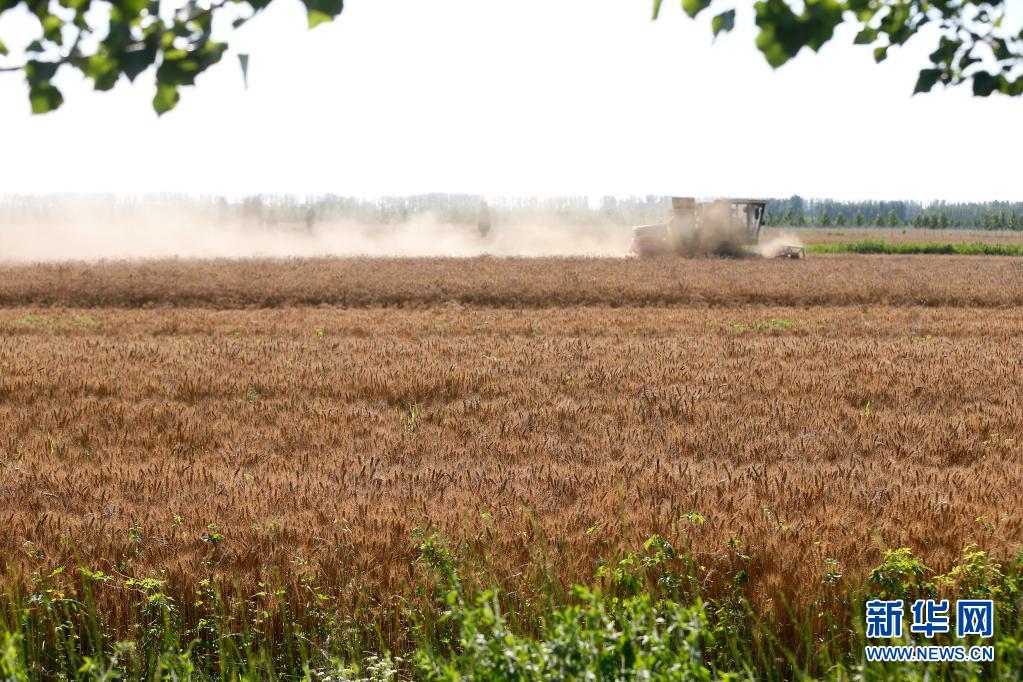 6月20日,收割機在山東省青島市即墨區(qū)段泊嵐鎮(zhèn)姜家坡村的麥田內(nèi)作業(yè)。