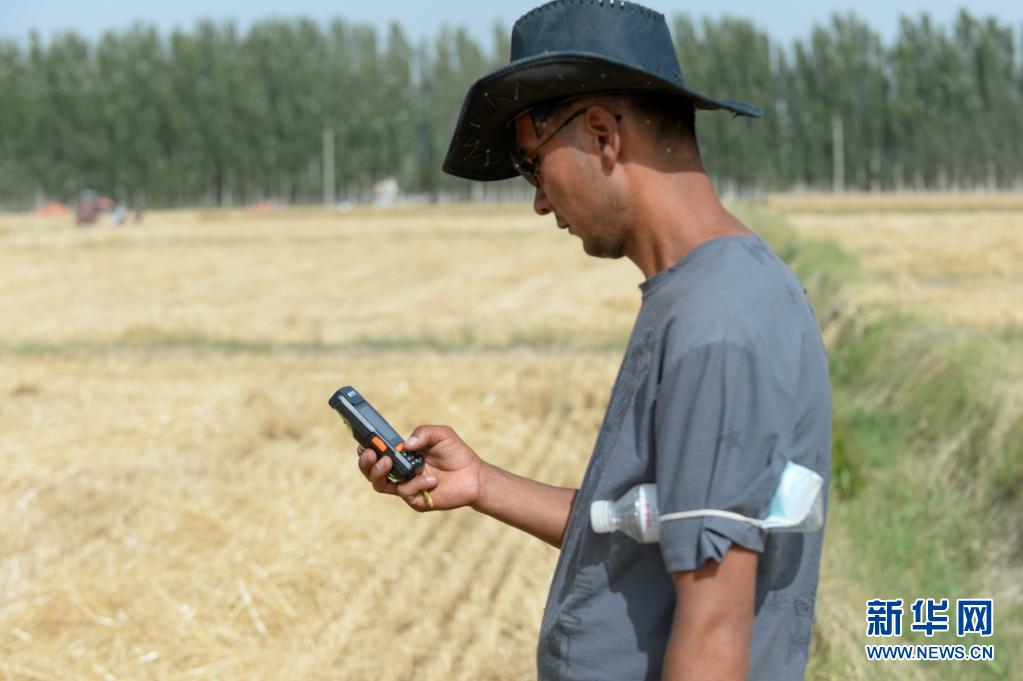 麥客阿地力·沙拉木在麥田間操作北斗導(dǎo)航控制器(6月19日攝)。新華社記者 高晗 攝