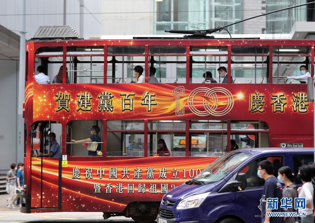 6月29日在香港街頭拍攝的叮叮車上的慶祝標(biāo)語(yǔ)。