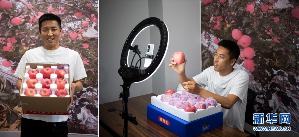拼版照片:左圖為郭鋒杰展示山西省吉縣產(chǎn)的蘋果;右圖為郭鋒杰通過網(wǎng)絡(luò)直播銷售蘋果(7月9日攝)。今年32歲的郭鋒杰是吉縣古賢村人,常年在外從事建筑行業(yè)。吉縣有“蘋果之鄉(xiāng)”的美譽(yù),看到吉縣蘋果在農(nóng)村電商領(lǐng)域的發(fā)展?jié)摿Γh杰經(jīng)過長期考察后,選擇返鄉(xiāng)創(chuàng)業(yè)。返鄉(xiāng)后,他忙著和果農(nóng)洽談合作,聯(lián)系各大商超,自己也開起了網(wǎng)店,做起了“主播”。