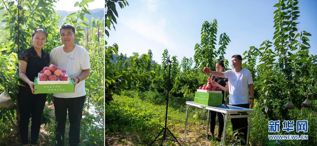 拼版照片:左圖為在山西省吉縣,武偉和妻子梁雪雪展示吉縣蘋果;右圖為武偉和妻子梁雪雪通過網(wǎng)絡直播銷售蘋果(7月9日攝)。今年30歲的武偉是山西省洪洞縣武家莊村人,2009年大學畢業(yè)后,他開過快遞公司,也做過微商。期間,他看到來自家鄉(xiāng)的蘋果存在質(zhì)高價低、銷售不暢的情況,于是開始通過電商銷售優(yōu)質(zhì)蘋果。今年以來,武偉和妻子趁著農(nóng)閑嘗試直播帶貨,沒想到短短數(shù)月粉絲量就已過萬。目前,只要天氣允許,他們每天都會直播兩場,日銷售蘋果500余單。