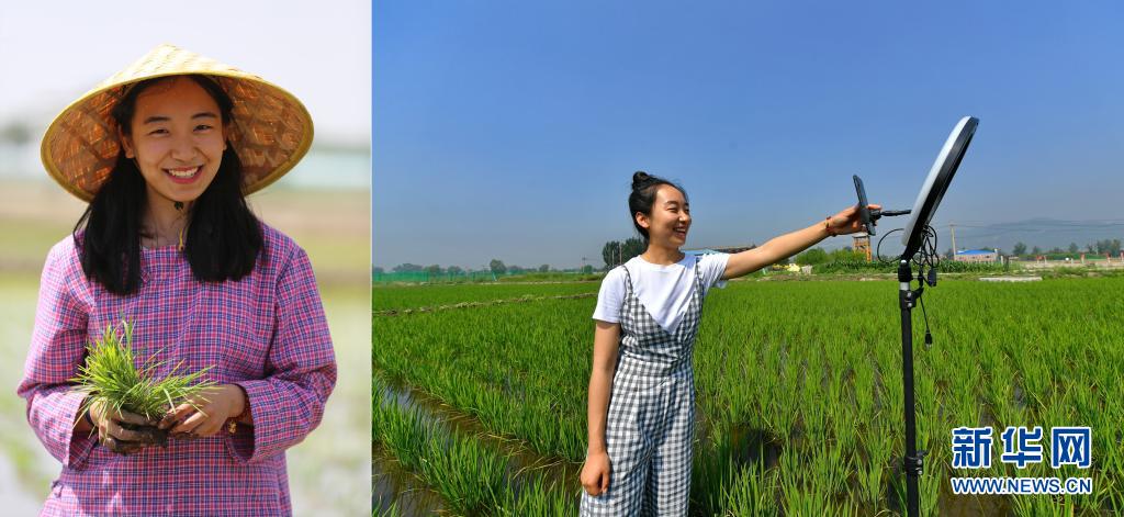 拼版照片:左圖為程玉嬌在太原市晉源區(qū)三家村水稻田里;右圖為程玉嬌在水稻田里進行直播(7月9日攝)。今年24歲的程玉嬌2019年留學回國后,選擇了返鄉(xiāng)創(chuàng)業(yè)發(fā)展稻魚菜綜合種養(yǎng)農(nóng)業(yè)。晉源區(qū)三家村出產(chǎn)的大米遠近聞名,程玉嬌在社交平臺上開通了雙語直播,在科普水稻知識的同時拓展銷售渠道,不僅生意做得風風火火,自己也變成了小有名氣的“網(wǎng)紅”。