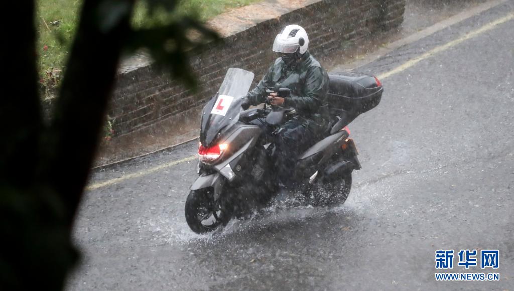 7月25日,一名男子騎著摩托車在英國(guó)倫敦的大雨中行駛。
