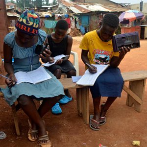 8月16日,學(xué)生在烏干達(dá)首都坎帕拉用收音機(jī)收聽無(wú)線電廣播的教學(xué)內(nèi)容。