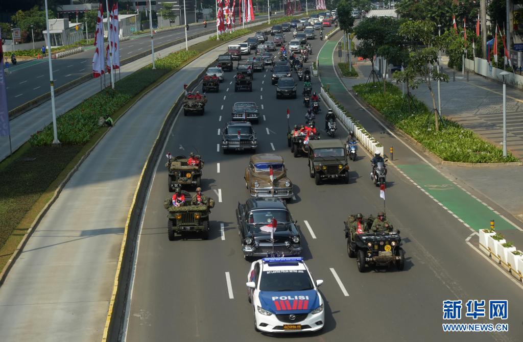 8月17日,參加印度尼西亞獨(dú)立日慶祝的車輛行駛在雅加達(dá)街頭。8月17日是印度尼西亞獨(dú)立日。新華社發(fā)(祖卡南攝)