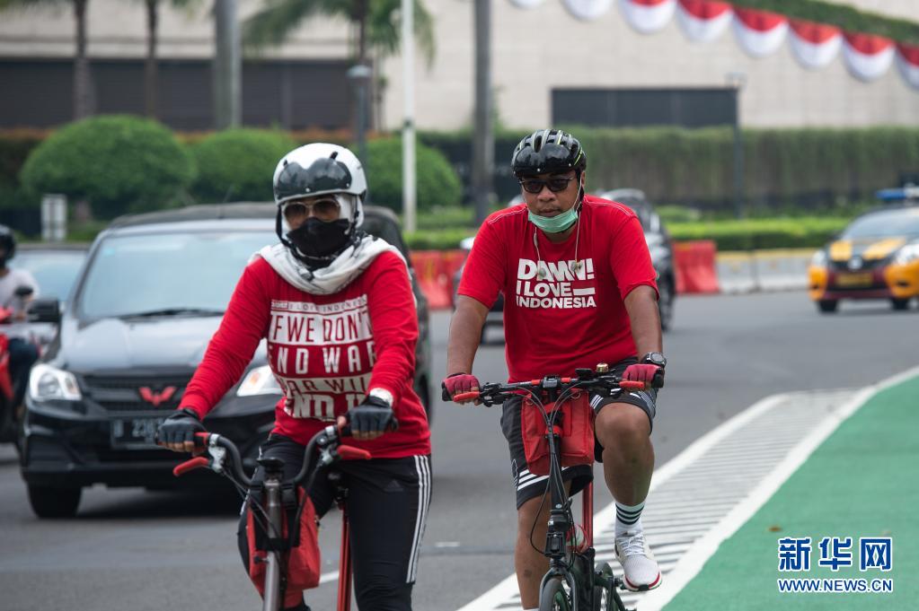 8月17日,人們身穿紅白配色服裝在雅加達(dá)街頭騎行,慶祝印度尼西亞獨(dú)立日。8月17日是印度尼西亞獨(dú)立日。新華社發(fā)(維里攝)