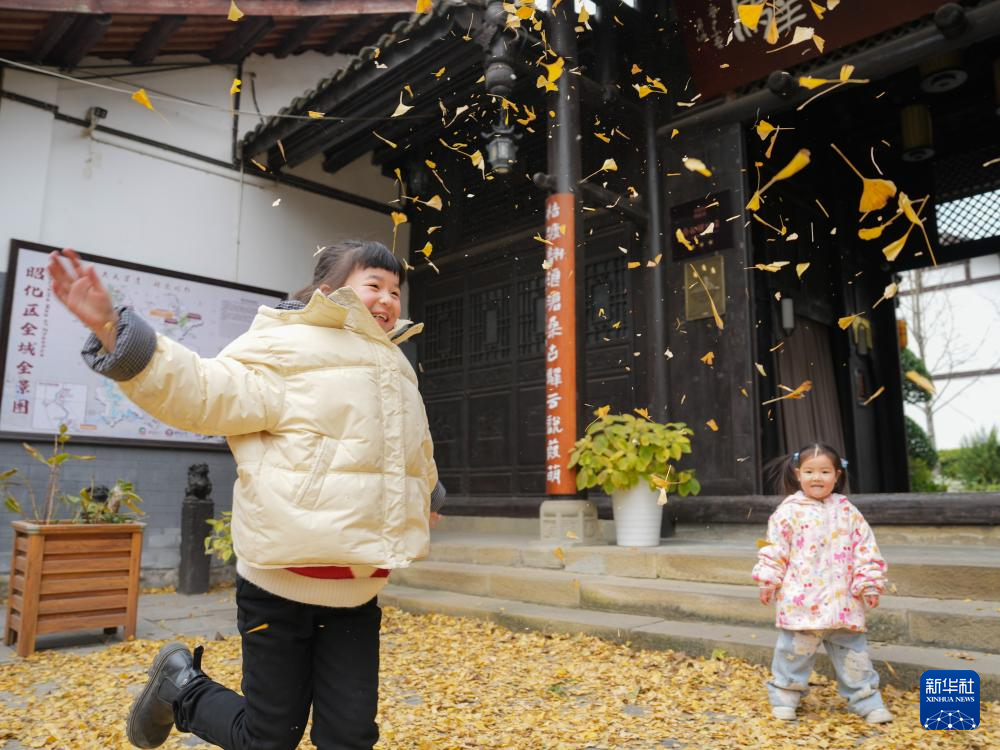 小朋友在昭化古城内的银杏树下游玩(12月13日摄)。