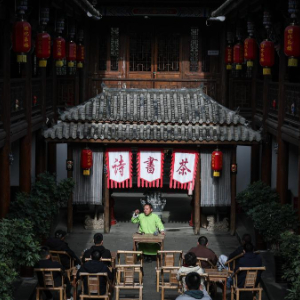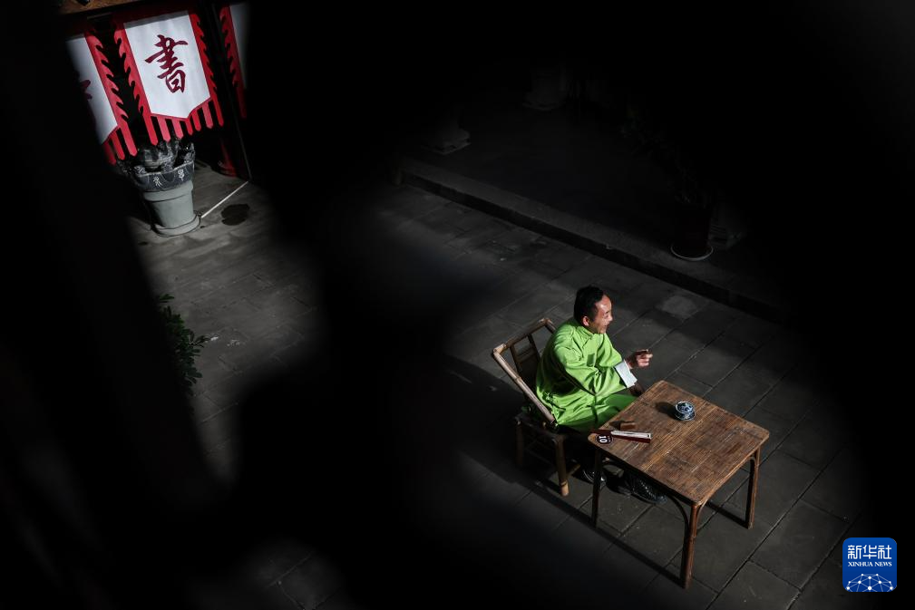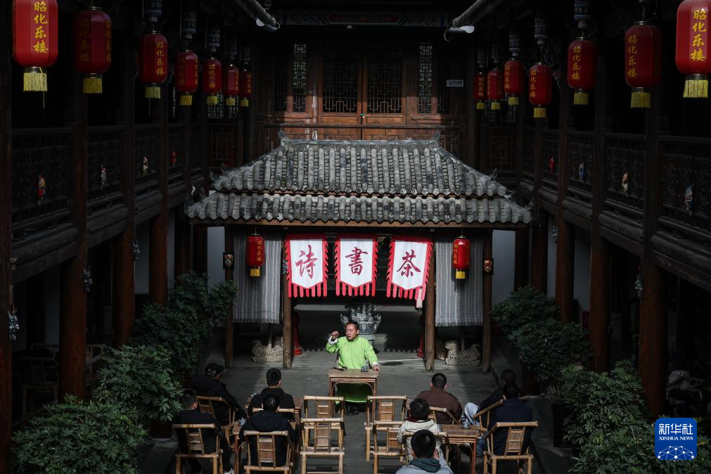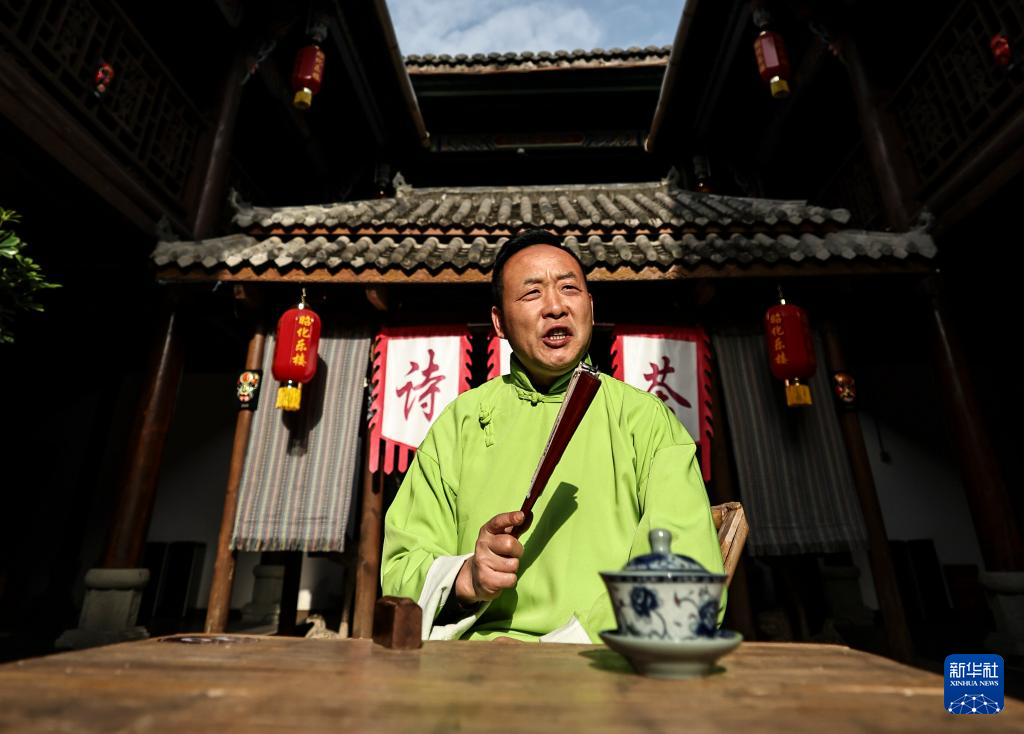 苟欢在昭化古城表演评书(12月13日摄)。苟欢是四川省非物质文化遗产川北雷棚评书的第五代传承人,在昭化评书馆从事评书艺术表演和蜀道文化传承工作。