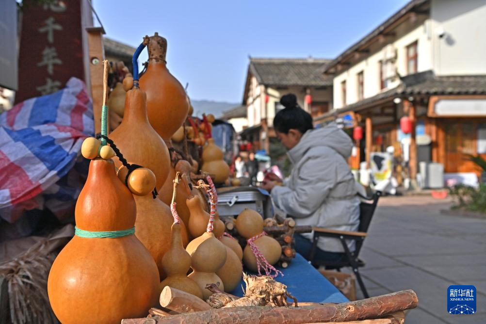 村民在昭化古城内用葫芦制作工艺品(12月13日摄)。