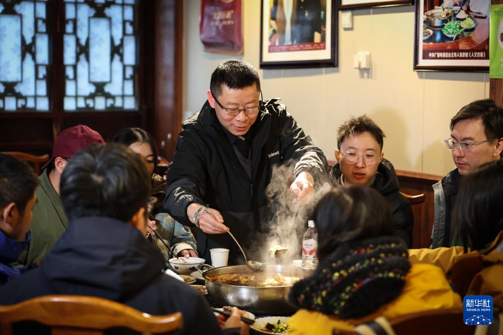 翟志刚在自己经营的餐馆内为客人提供服务(12月13日摄)。在昭化古城土生土长的翟志刚经营着一家餐馆,同时他还是昭化区蜀道三国文化研究会秘书长,业余时间投身于昭化古城文化遗产保护与研究工作。