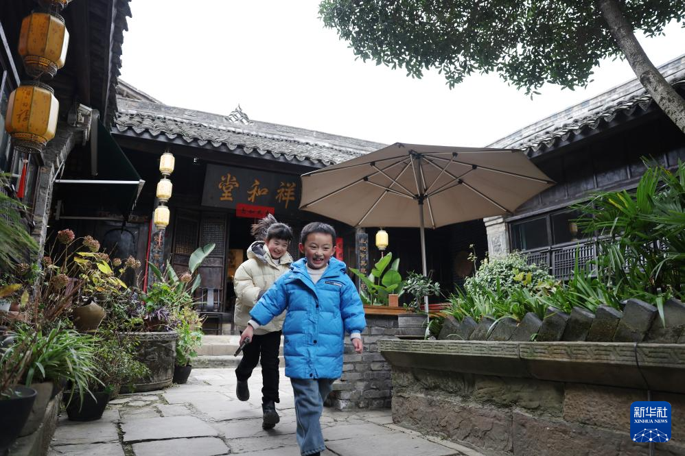 小朋友在昭化古城一家民宿内玩耍(12月13日摄)。
