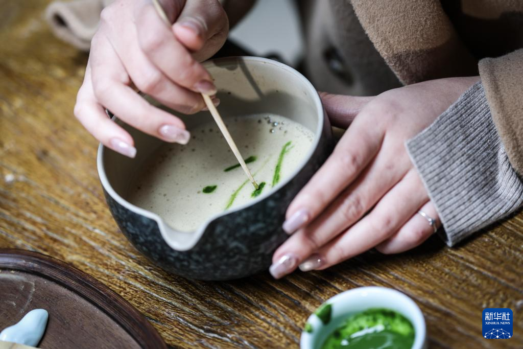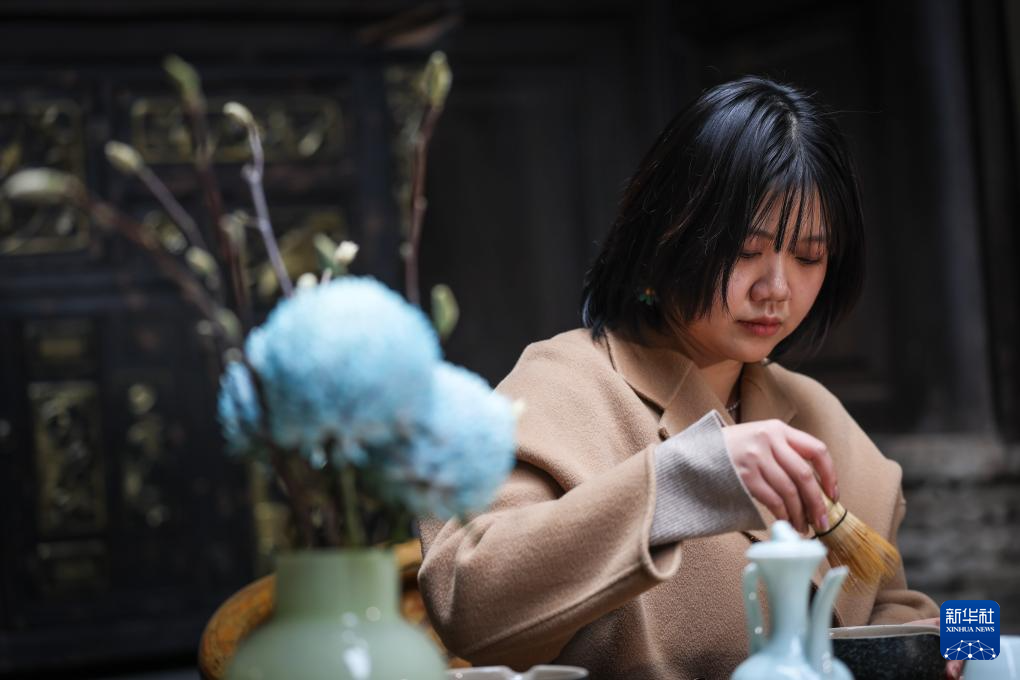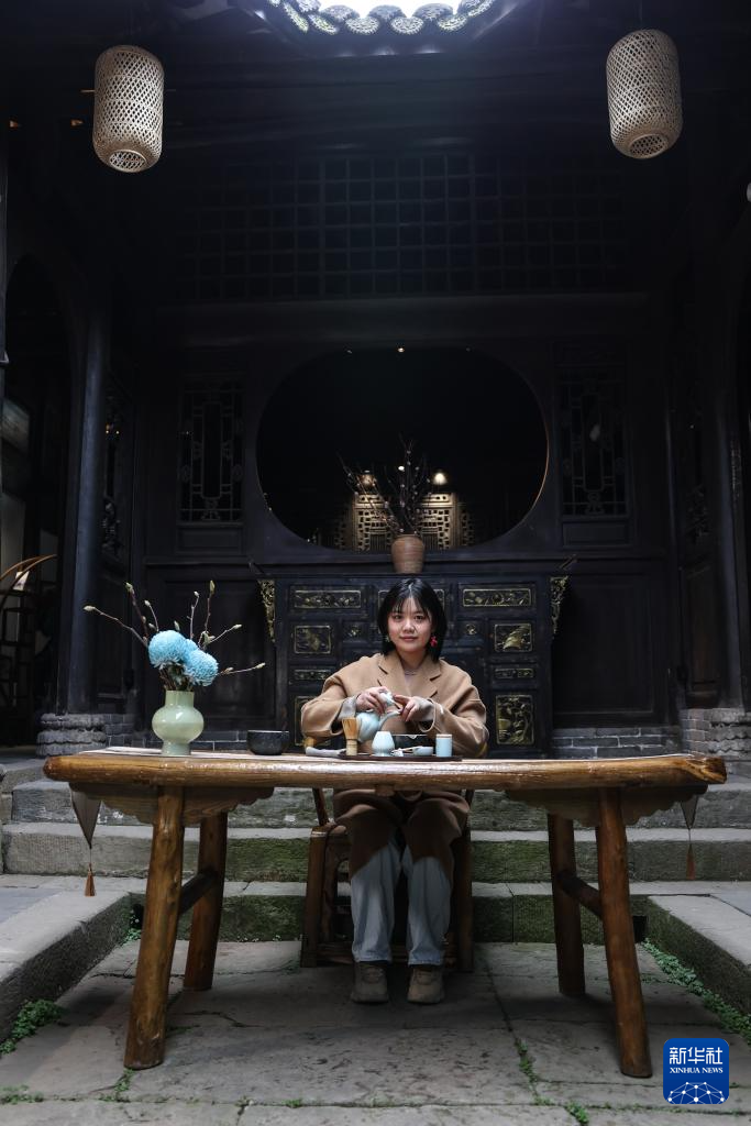 “95后”茶室主理人杨沫在昭化古城一家茶室内制作茶品(12月13日摄)。
