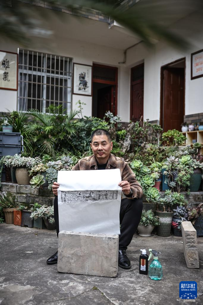 昭化区昭化镇汉砖收藏爱好者饶斌在家中展示汉砖拓印作品(12月13日摄)。饶斌十多岁开始在田边地头收捡残砖,2010年开始大量收藏汉代画像砖。