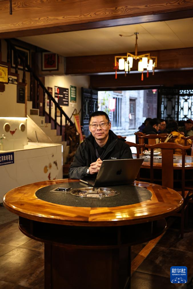 翟志刚在自己经营的餐馆内(12月13日摄)。在昭化古城土生土长的翟志刚经营着一家餐馆,同时他还是昭化区蜀道三国文化研究会秘书长,业余时间投身于昭化古城文化遗产保护与研究工作。