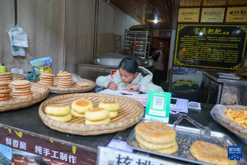 在昭化古城的商铺里,一名小姑娘一边看摊儿一边写作业(12月13日摄)。