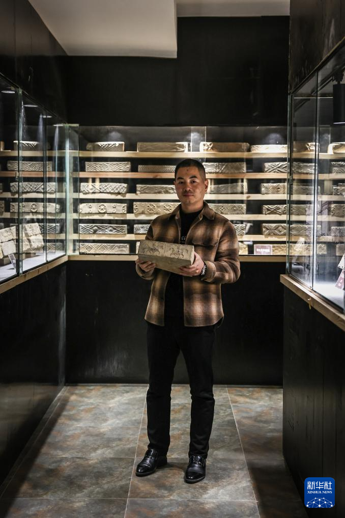 昭化区昭化镇汉代画像砖收藏者饶斌在自己的收藏馆里(12月13日摄)。饶斌十多岁开始在田边地头收捡残砖,2010年开始大量收藏汉代画像砖。