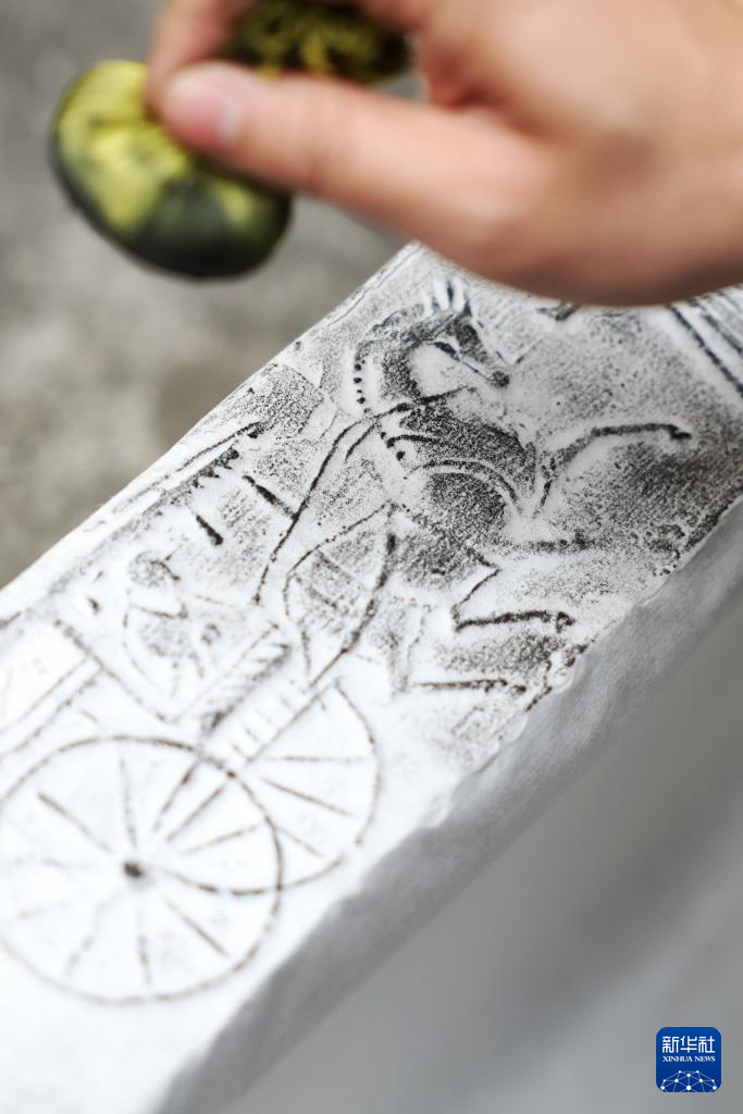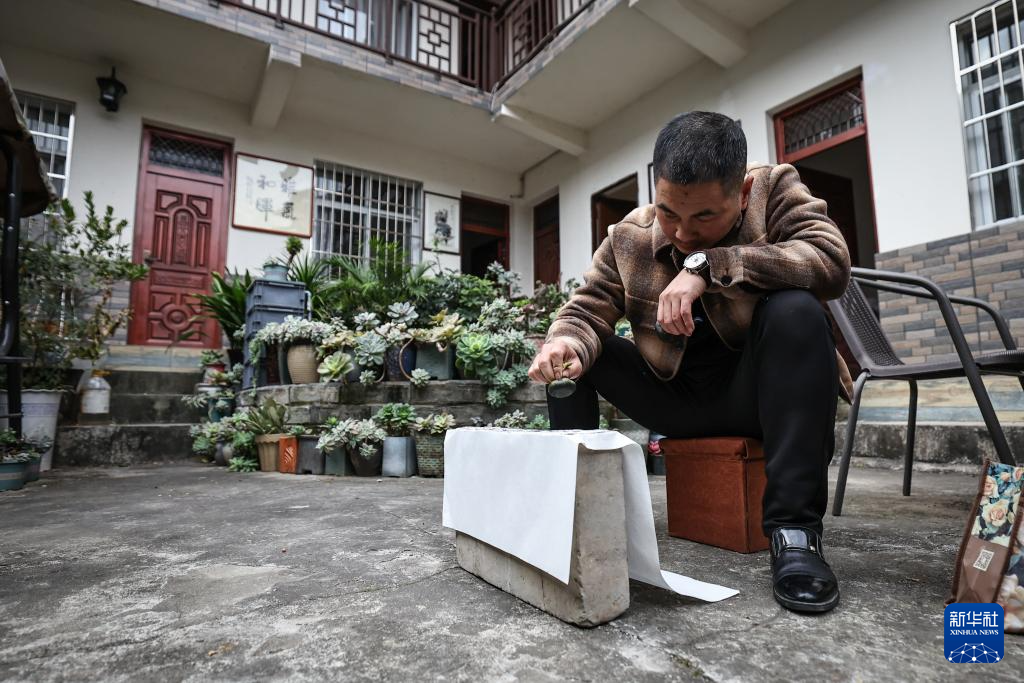 昭化区昭化镇的汉砖收藏爱好者饶斌在家中拓印汉砖(12月13日摄)。饶斌十多岁开始在田边地头收捡残砖,2010年开始大量收藏汉代画像砖。