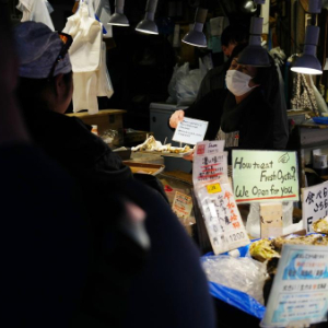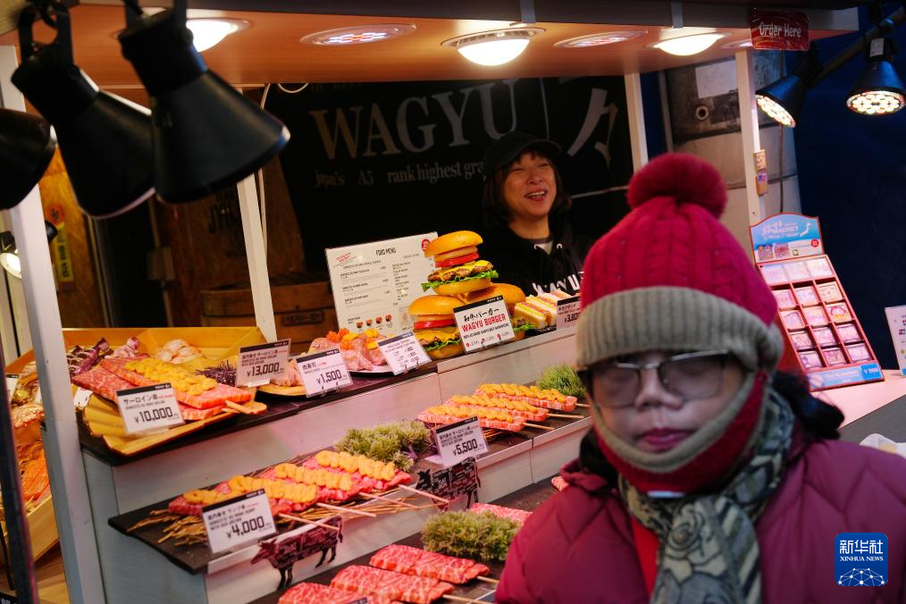 12月18日,在日本东京筑地站附近,一家店铺的店员招揽生意。