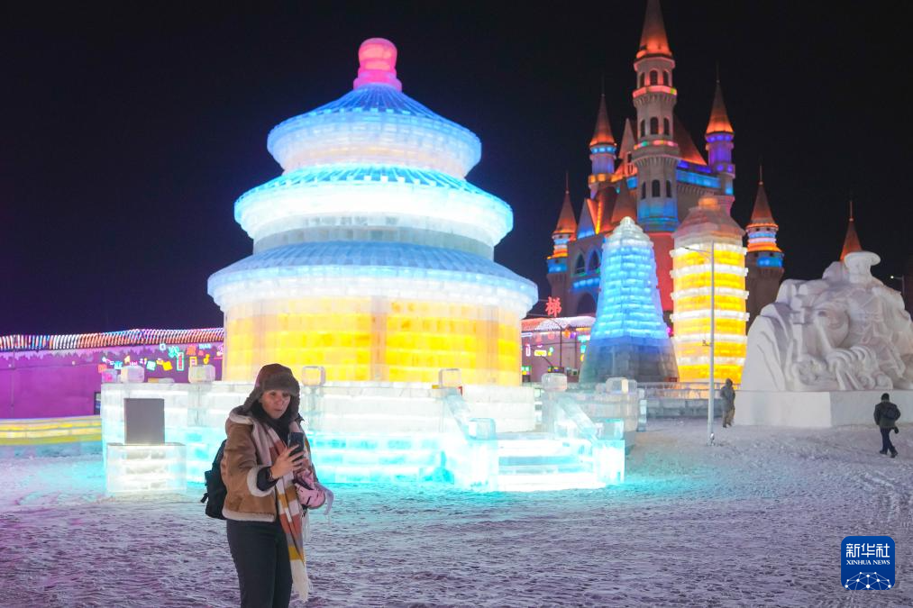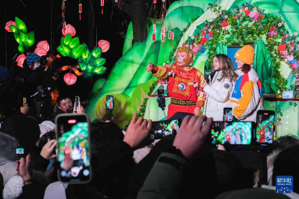 12月18日,外国媒体记者在长春市冰雪新天地景区录制出镜视频。