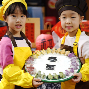 12月19日,在河南省济源市第一幼儿园,孩子们展示自己包的饺子。