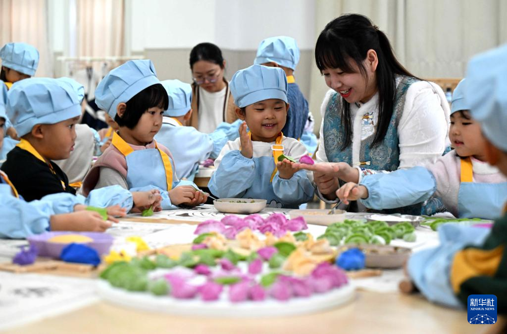 12月19日,在河北省石家庄新乐市市直第二幼儿园,老师教小朋友包饺子。