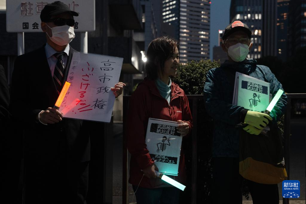 针对高市早苗政府计划近期修改“防卫装备转移三原则”及其运用指南,日本民众16日晚在东京的首相官邸前举行抗议集会,反对解禁杀伤性武器出口。