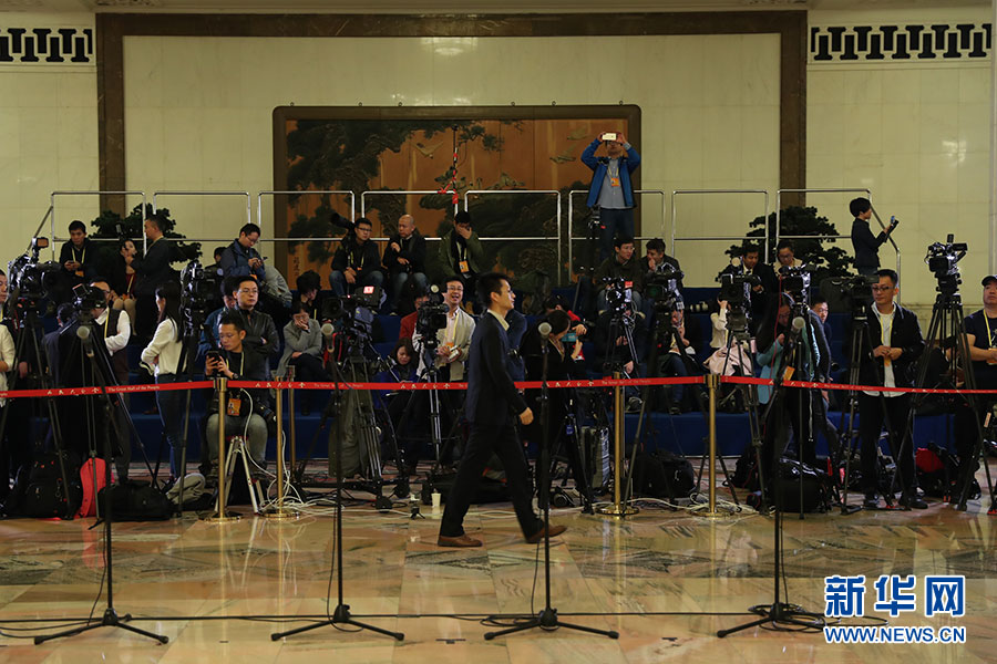 10月19日,“黨代表通道”第二場采訪活動在人民大會堂舉行。圖為現(xiàn)場媒體記者正在做采訪準備。新華網 翟子赫 攝