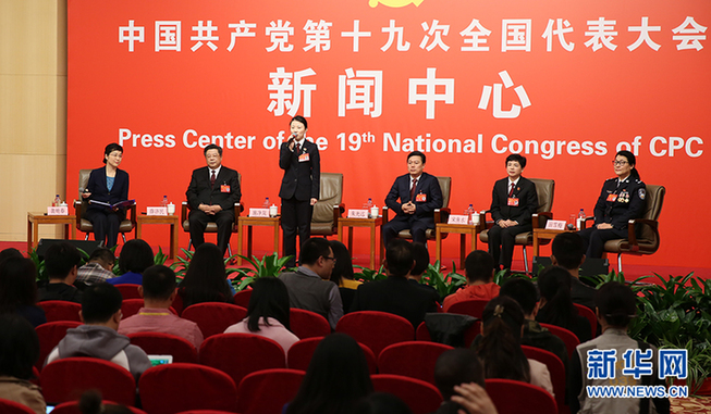 ??? 10月19日,十九大新聞中心舉辦集體采訪,邀請政法戰(zhàn)線代表談推進全面依法治國。圖為采訪現(xiàn)場。新華網 郝廣鵬攝