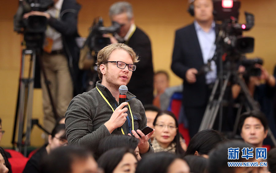??? 10月21日,十九大新聞中心舉辦記者招待會(huì),邀請(qǐng)中共中央統(tǒng)戰(zhàn)部常務(wù)副部長(zhǎng)張裔炯、副部長(zhǎng)冉萬(wàn)祥,中共中央對(duì)外聯(lián)絡(luò)部副部長(zhǎng)郭業(yè)洲介紹黨的統(tǒng)一戰(zhàn)線工作和黨的對(duì)外交往情況,并回答記者提問(wèn)。圖為彭博新聞社記者提問(wèn)。新華網(wǎng) 郝廣鵬攝