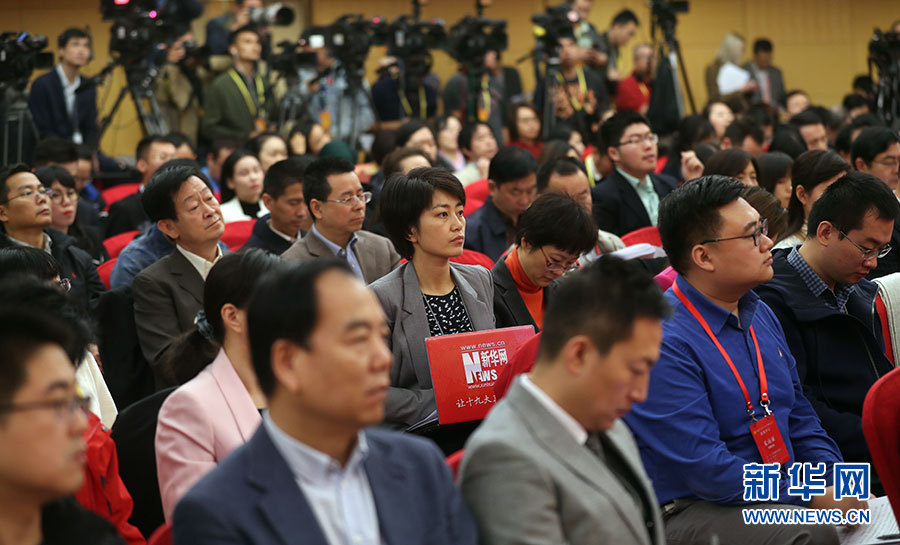 10月22日,十九大新聞中心舉辦記者招待會(huì),邀請(qǐng)教育部黨組書記、部長陳寶生,民政部黨組書記、部長黃樹賢,人力資源社會(huì)保障部黨組書記、部長尹蔚民,住房城鄉(xiāng)建設(shè)部黨組書記、部長王蒙徽,國家衛(wèi)生計(jì)生委黨組書記、主任李斌介紹滿足人民新期待,保障改善民生有關(guān)情況,并回答記者提問。圖為現(xiàn)場記者。新華網(wǎng) 郝廣鵬攝