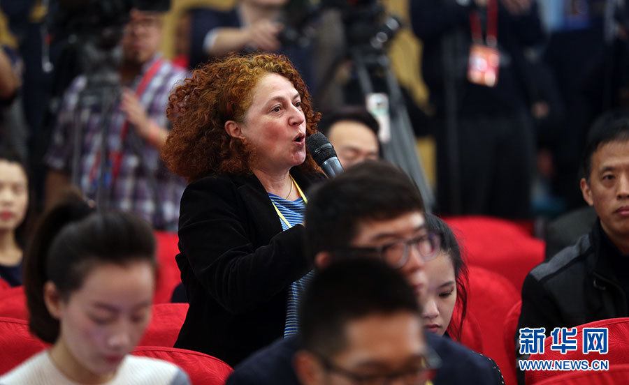 10月22日,十九大新聞中心在梅地亞中心二層新聞發(fā)布廳舉辦集體采訪活動,主題為“中國特色強軍之路邁出堅定步伐”。圖為意大利24小時太陽報記者提問。新華網(wǎng) 郝廣鵬攝