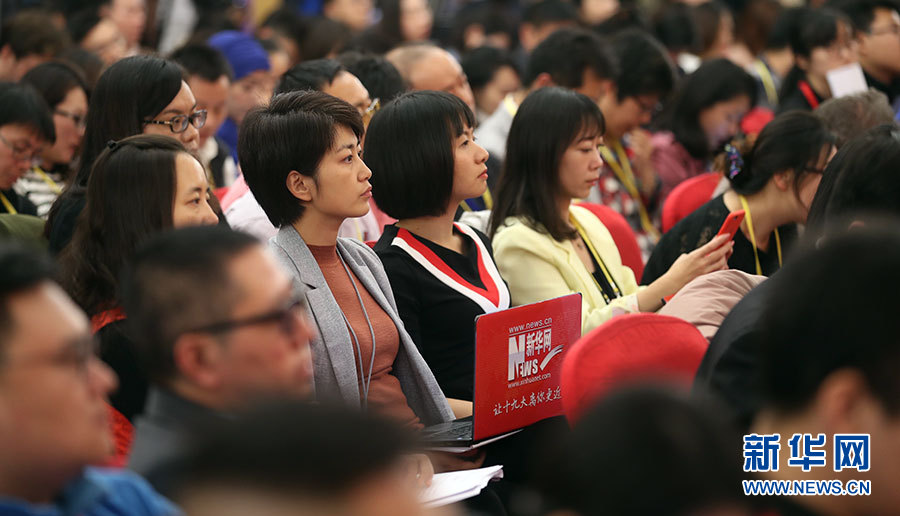 10月23日,十九大新聞中心舉辦記者招待會,邀請中央財經(jīng)領導小組辦公室副主任楊偉民,環(huán)境保護部黨組書記、部長李干杰介紹踐行綠色發(fā)展理念,建設美麗中國有關情況,并回答記者提問。圖為現(xiàn)場記者。新華網(wǎng) 郝廣鵬攝