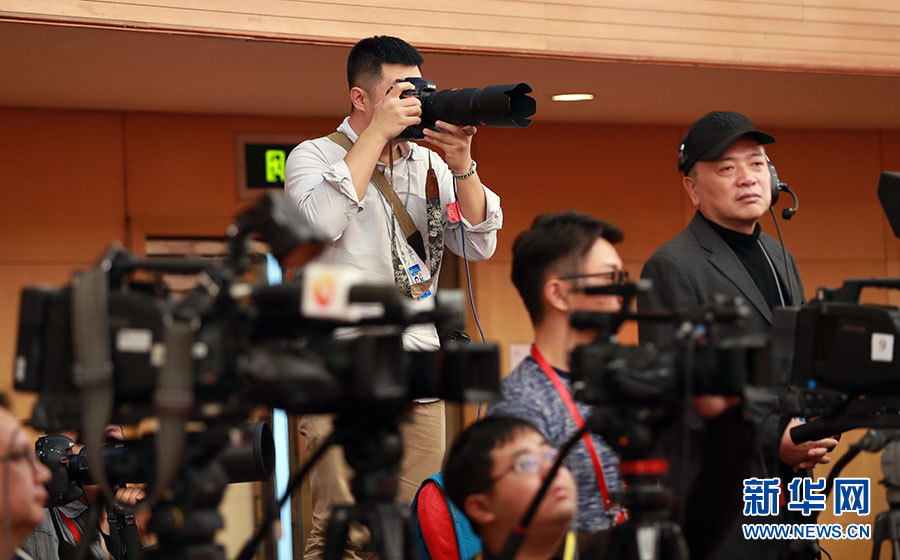 10月23日,十九大新聞中心舉辦集體采訪活動,主題為“打好生態(tài)環(huán)保攻堅戰(zhàn)”。圖為現場記者。新華網 郝廣鵬攝