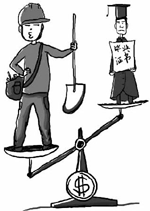 農(nóng)民工被“幸?!迸c大學(xué)生被“懂事”,掩蓋了農(nóng)民工薪酬普遍偏低與大學(xué)生就業(yè)難的事實(shí)。而糾結(jié)于兩者之間的一個(gè)詞叫“知識(shí)”。農(nóng)民工并非沒(méi)有知識(shí),就某一崗位而言,他們的實(shí)際知識(shí)可能豐富得很,專業(yè)技能也爐火純青,但他們得到的回報(bào)與艱辛的付出明顯不匹配,打工者往往十年如一日地和機(jī)器站在一起忙碌著,但是最后留給他們的可支配收入并不多。而大學(xué)畢業(yè)生,不管他們?cè)诖髮W(xué)里學(xué)到了多少知識(shí),或?qū)W到的知識(shí)是否有利于就業(yè),對(duì)他們中的很多人來(lái)說(shuō),家庭為購(gòu)買這“知識(shí)”付出的成本是極大的,教育高投入?yún)s不能實(shí)現(xiàn)高產(chǎn)出,甚至還要與不曾付出高教育成本的民工爭(zhēng)一日之短長(zhǎng),顯然也是于心不甘的。 …[詳細(xì)] |