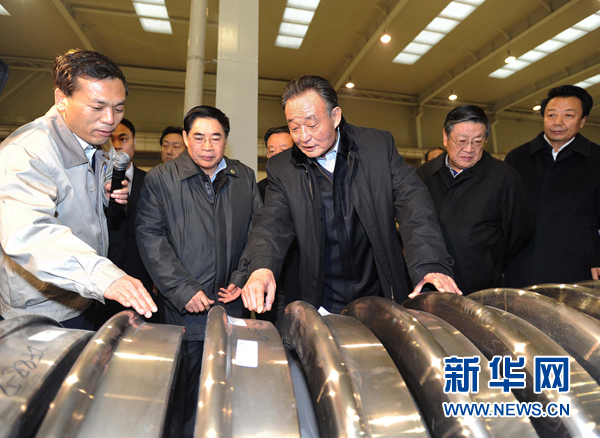 ????11月19日至23日,全國(guó)人大常委會(huì)委員長(zhǎng)吳邦國(guó)在山西調(diào)研。這是11月20日,吳邦國(guó)在太原重工集團(tuán)高速輪對(duì)國(guó)產(chǎn)化項(xiàng)目現(xiàn)場(chǎng)詳細(xì)了解工藝流程和技術(shù)指標(biāo)。 新華社記者 李濤 攝