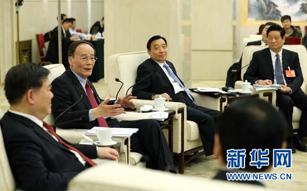 ??? 新華網(wǎng)北京3月9日電 中共中央政治局常委、中央紀(jì)委書記王岐山9日下午在十二屆全國人大二次會議陜西代表團(tuán)參加審議。