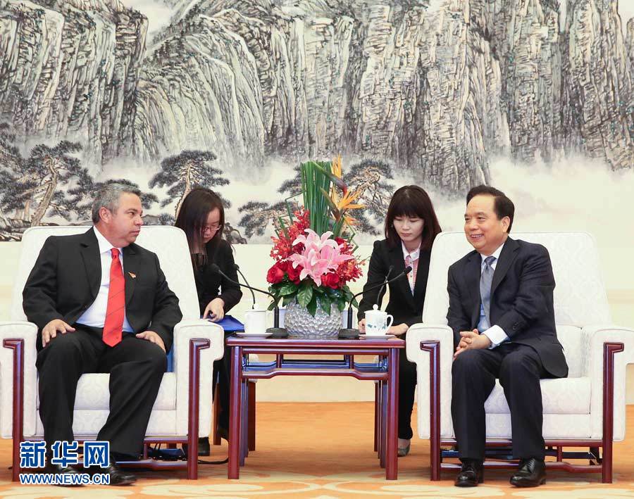 ??? 4月8日,中共中央政治局委員、中華全國(guó)總工會(huì)主席李建國(guó)在北京會(huì)見古巴國(guó)務(wù)委員會(huì)委員、古共中央委員、古巴工人中央工會(huì)總書記吉拉特。新華社記者丁林?jǐn)z