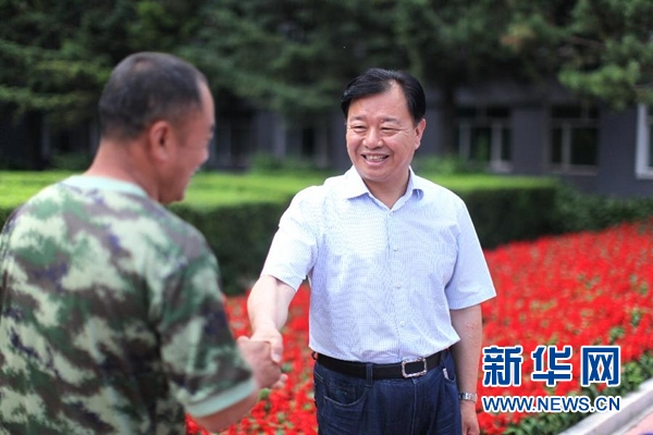 威縣縣委書記呂志成(右)到?jīng)持萱?zhèn)邱霍寨村慰問(wèn)老黨員邱西臣( 2015年6月23日) 。
